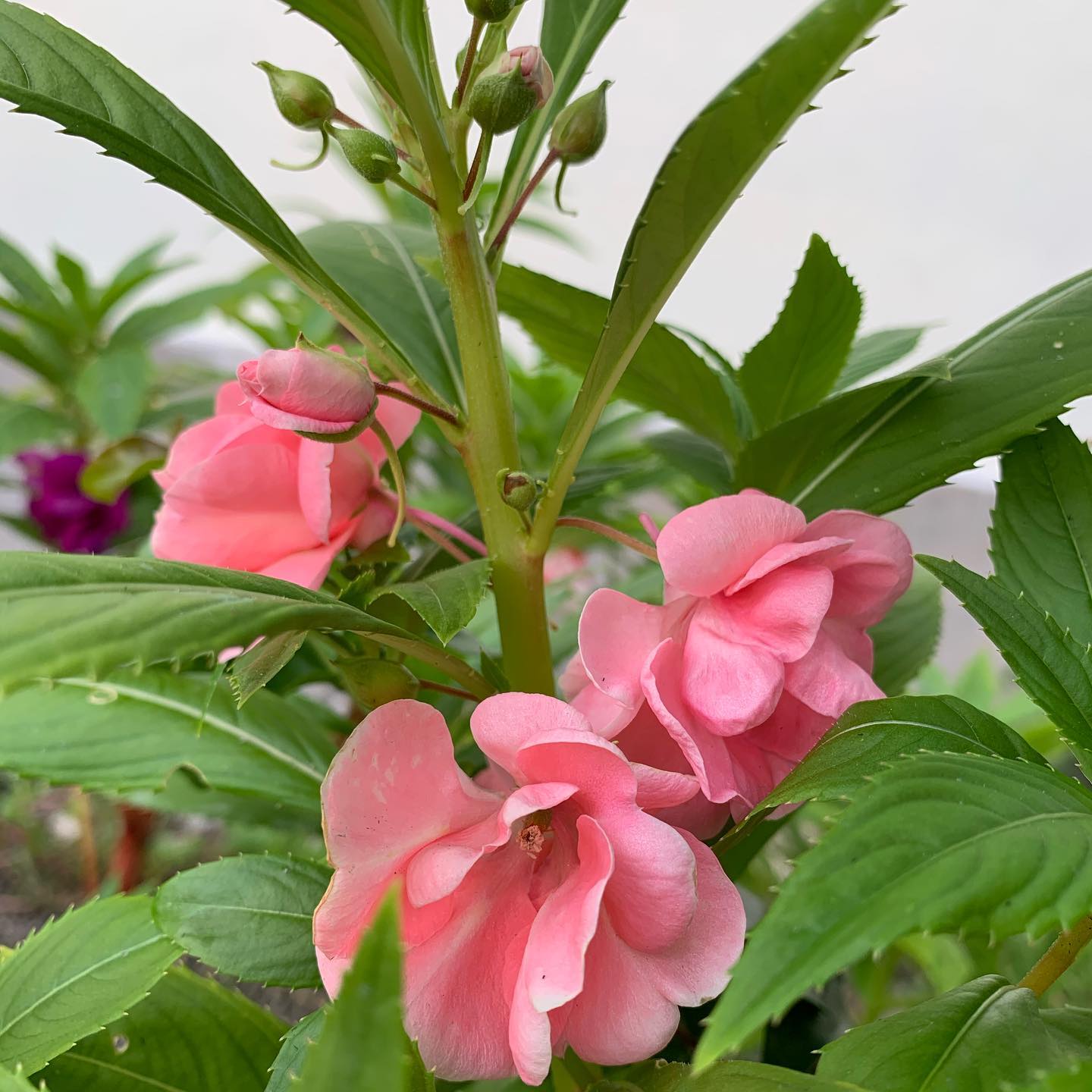 A charming heirloom balsam with soft cherry-pink blooms that resemble miniature roses dancing on lush green foliage.