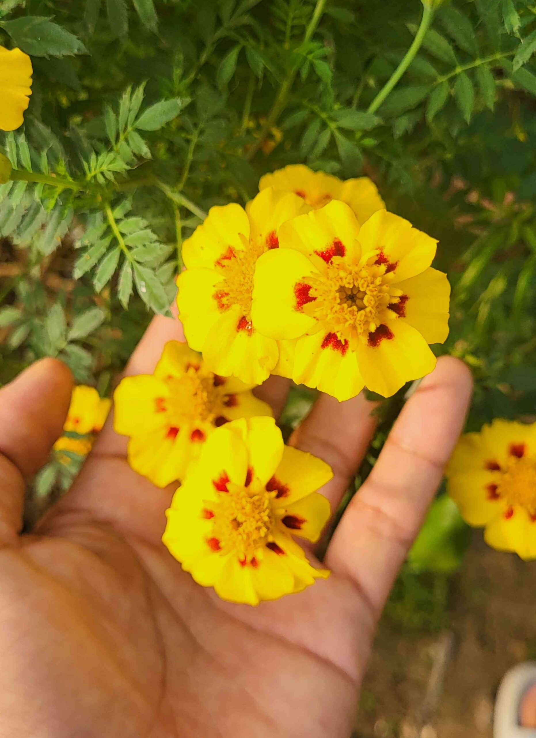 - Classic bicolour French marigold: bright golden-yellow petals with striking mahogany-red/bronze centres.