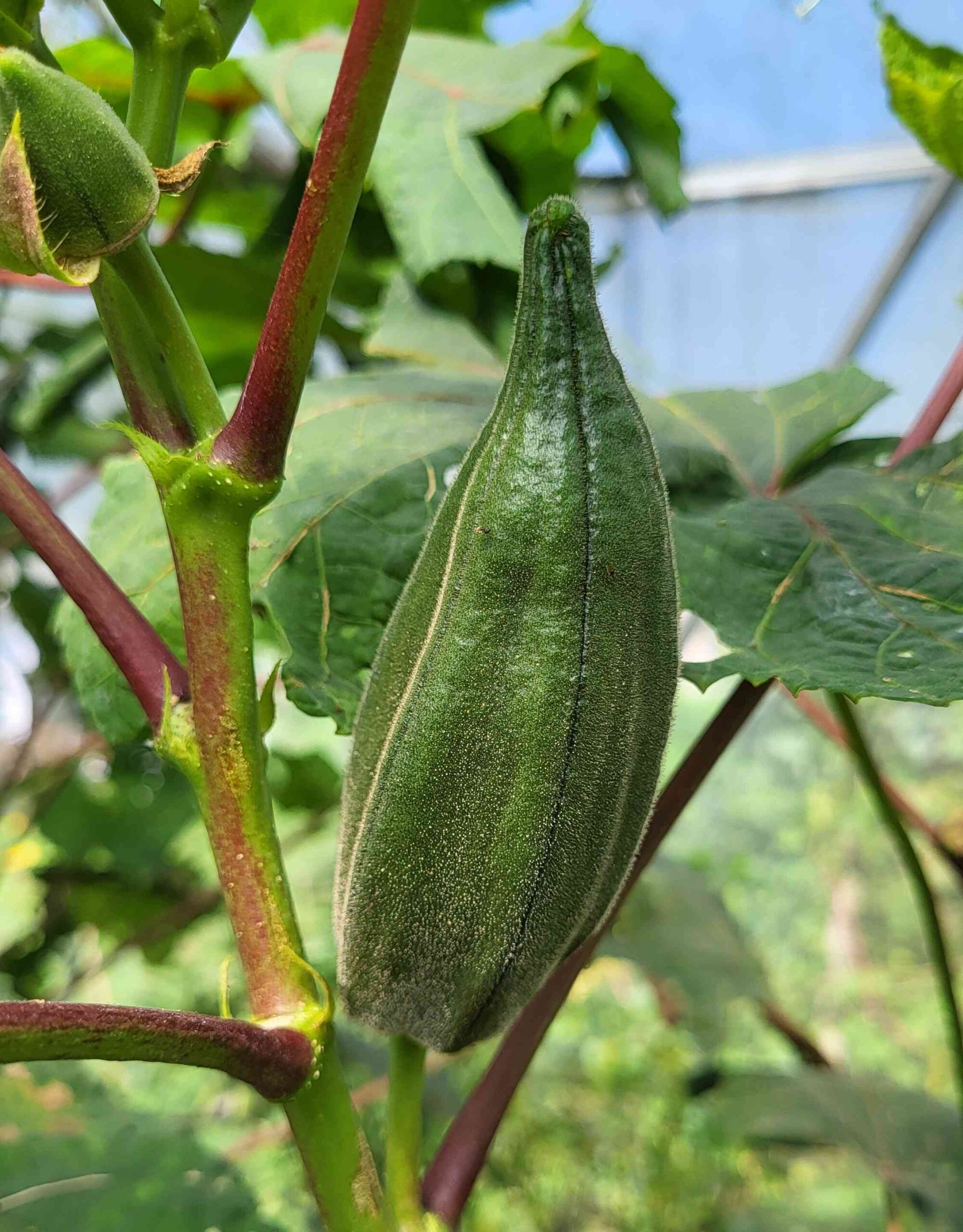 Vibrant red stems, spineless dark green leaves, and pods in a rich green shade sometimes accented with red or purple tones. Expect substantial, thick-walled pods around 4-6 inches when ready for harvest, along with generous flowers and a thick calyx.